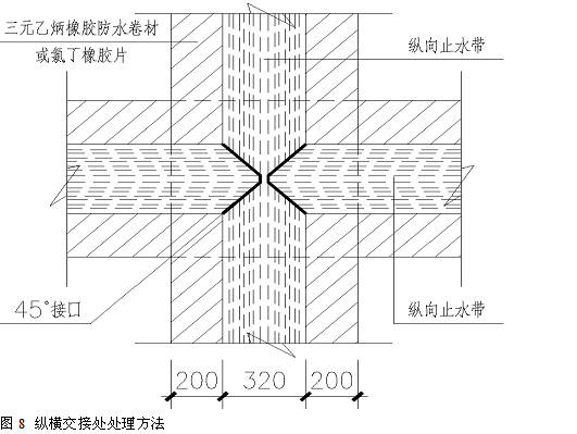 橡膠止水帶縱橫交接處,在混凝土墊層上沿縱橫止水帶外側(cè)向外擴展各200mm,其間粘貼3mm厚的三元乙丙橡膠防水卷材或氯丁橡膠片(粘貼于墊層之上,要牢固)。然后將橫向止水帶兩邊沿45°角斷開,并與縱向止水帶拼接嚴密。再用401 防水膠將止水帶與防水卷材或橡膠片粘貼牢固,并在接口處刷氯丁膠粘劑,將接口包實。如圖8 所示。